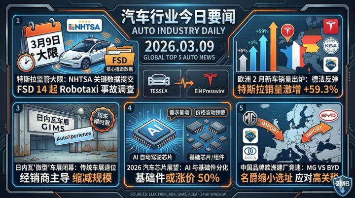 主编点评: 今天的头条无疑属于特斯拉和 NHTSA。 March 9 不仅仅是一个日期,它是**“软件定义汽车”**时代,监管透明度与车企商业秘密之间的一次正式硬碰硬。特斯拉能否通过这份数据自证其奥斯汀 Robotaxi 业务的安全性,将直接决定其 2026 年全年的股价走势。